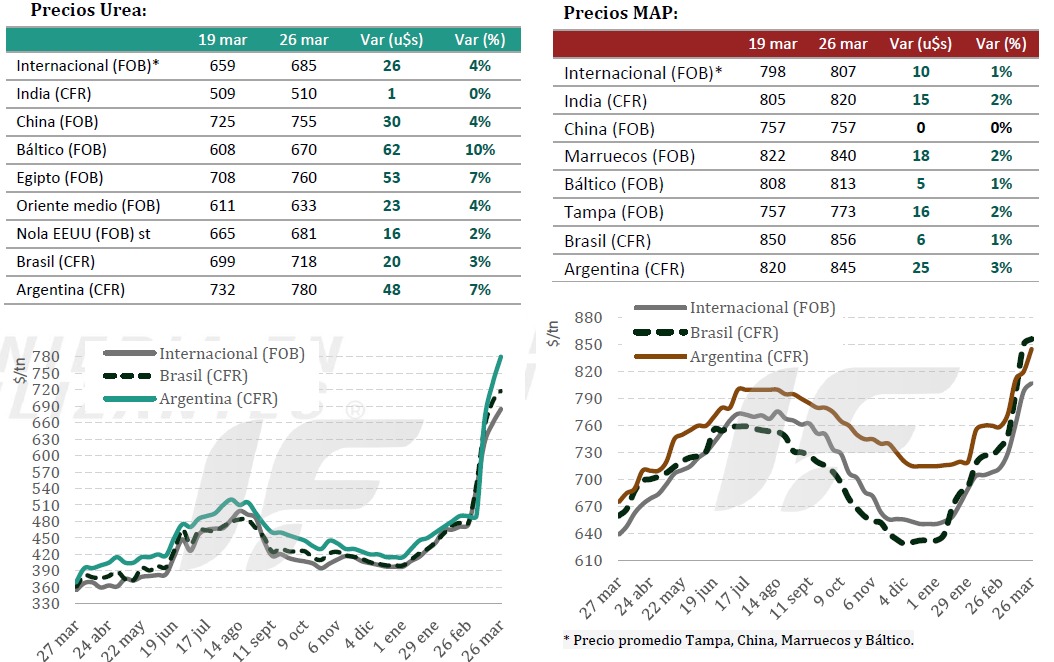 Mientras tanto, el impacto más evidente ya se da en los precios. La urea registró subas de hasta el 50% a nivel internacional, pasando de valores cercanos a US$490 por tonelada a unos US$665, mientras que en la Argentina se ubica en torno a los US$850. En el caso de los fertilizantes fosfatados, los aumentos oscilan entre el 15% y el 20%, en línea con una tendencia global alcista.